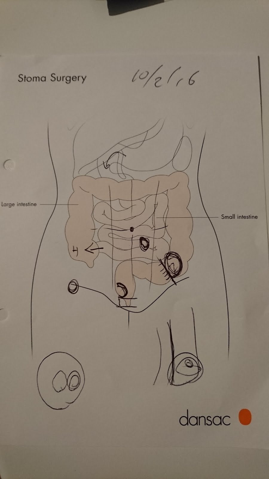 Je zou dus denken aha, eerst bestralen en chemo. Hmmm… niet helemaal dus. Door de bestraling gebeurt er van alles in je lijf. Er kunnen zwellingen ontstaan en dat is waar je net niet op zit te wachten, want dat betekent dat de darmen verstopt raken. No need to tell wat er dan met de inhoud zou kunnen gaan gebeuren. Om ontploffingsgevaar en alle ellende van dien te voorkomen is het beslist noodzakelijk om de gezonde meters darm in veiligheid te brengen. Dat kan. Moet er alleen “even” een stomaatje aangelegd worden. Boven de tumor wordt de darm doorgeknipt, het gezonde deel wordt dan via een omleiding door de buikwand naar buiten gebracht, voilá stomá. Nu is de tumor vrij van de rest en kan ingestraald gaan worden.