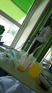Of ik mijn littekens soms even wilde zien, vroeg de zaalarts nog. Mwah… Vandaag ook nog niet zo’n trek in, eerlijk gezegd. Ik vind dat er al genoeg aan mijn lijf gerommeld is vanmorgen. Morgen maar, opper ik. Weet u wat, ik haal dan wel het epiduraal even helemaal wel weg, stelde hij voor, ik kom zo terug. En evenlater lag ik op mijn zij terwijl hij zat friemelen bij mijn ruggengraat. Brrrr, ik vond het maar eng. Eng voor niets, want of course stelde het drie keer niks voor. Weg slangetje! Weer een minder. Nu nog 4 te gaan: het infuus, de maagdrain, de drain voor het wondvocht en de drain van de rechtstreekse katheter. Mijn toetje is inmiddels bezorgd, yoghurt met aardbeien en nog maar weer een ander kleurtje limo, want drinken zal ik!