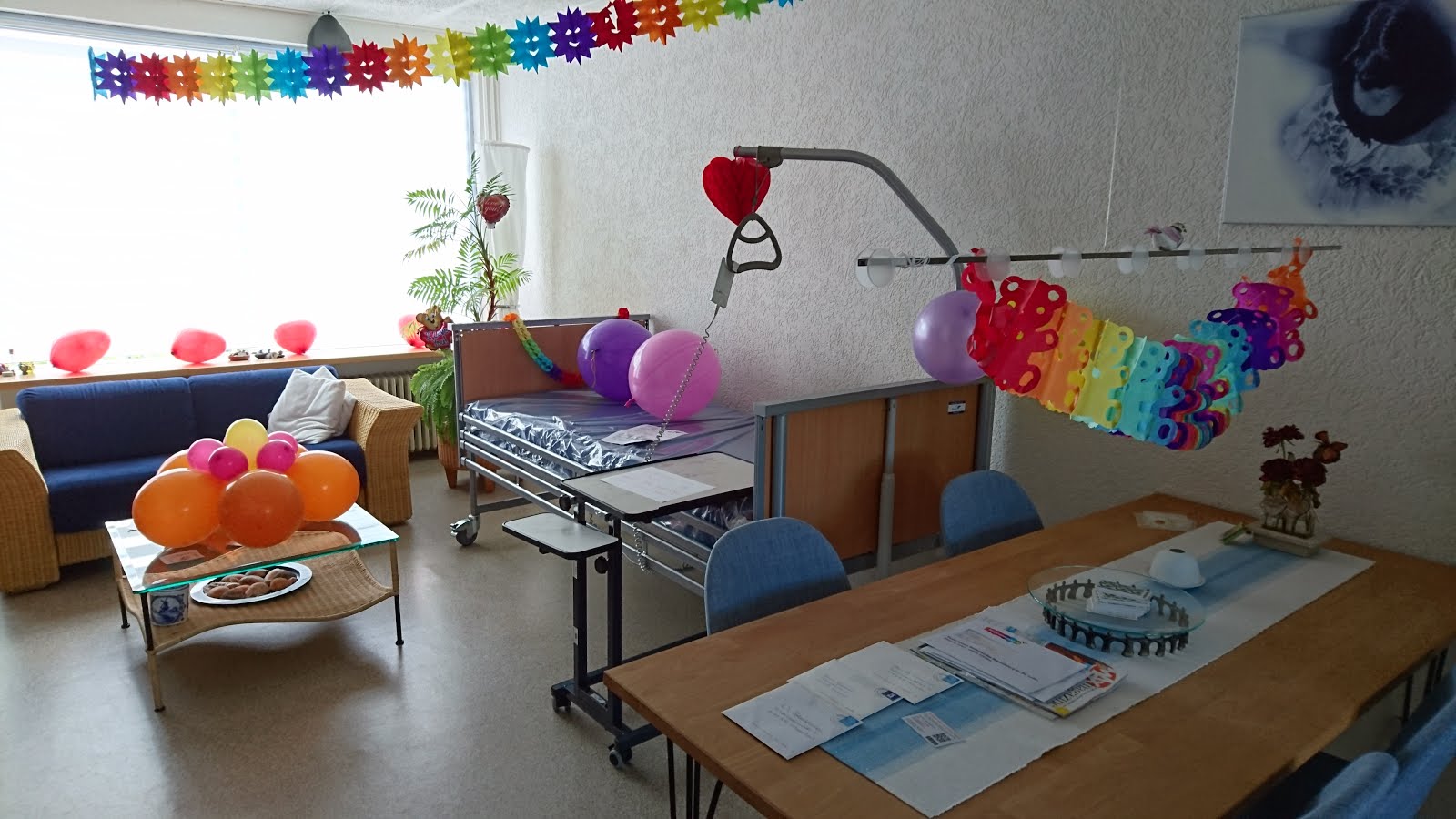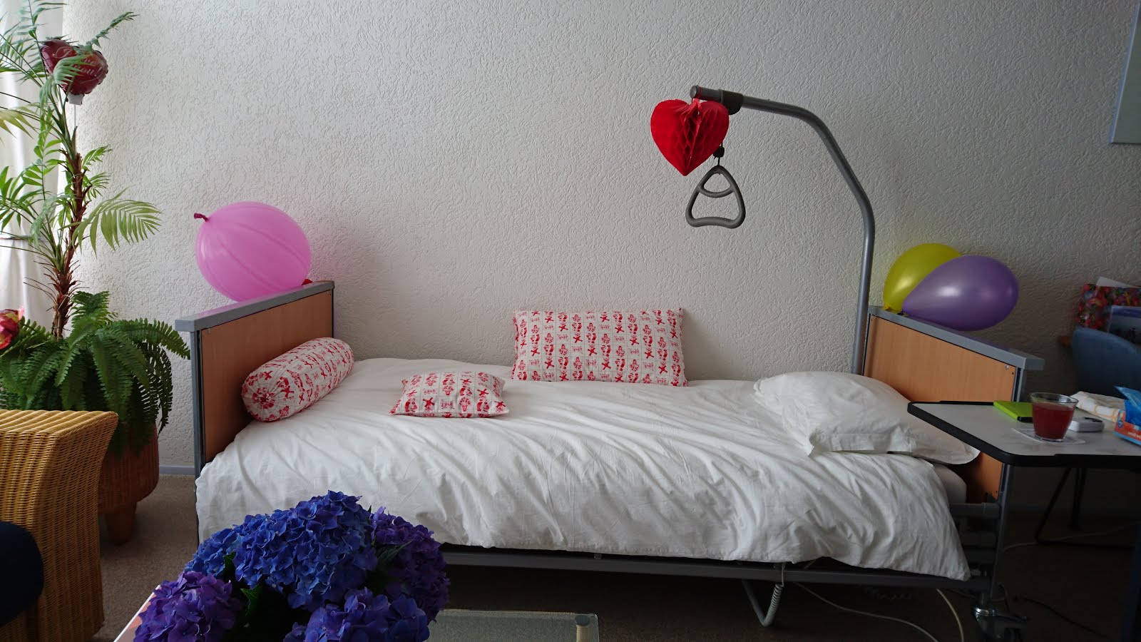 De rit in de auto naar huis was niet echt bepaald een feestje, maar het betreden van de huiskamer des te meer. Neefjelief zou het zorgbed in ontvangst nemen en daarna heeft hij zich uitgeleefd met ballonnen en slingers. Fantastisch! Wat een thuiskomst 🙂
