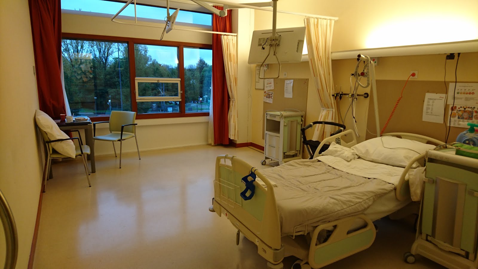 Een sfeerimpressie, just before breakfast. Gisteren mocht mijn Roomy naar huis en zat om 9:00 uur al in z’n startblokpyjama. Wachten wachten wachten. Busje komt zo (in dit geval de ambulance) Uiteindelijk is hij na 20:00 uur pas opgehaald. “Zooo, daar zijn we al!” zei het ambulancepersoneel met een big smile. Of je wil of niet, dan schiet je toch even in de lach hoewel ik het echt met naar-huis-hunkerende-Roomy had te doen. Zijn bed werd afgevoerd en zo kreeg ik meer lucht. Jammer dat dat alleen voor de ruimte geldt, en niet voor die suffe longen van mij. Vanmiddag ga ik verhuizen, ik ga toch maar bij het raam liggen zoals mij was aangeboden, nu zit ik zo opgepropt bij het kotsbakkenkastje. Verder is en blijft het rustig dit weekend. Er komt niemand bij op zaal, er zijn zelfs zes lege bedden op de afdeling en ook via de SEH komt er niet zomaar iemand hier binnen.