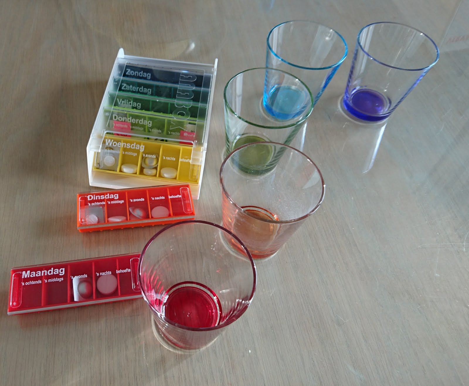 Op de terugweg hebben we een zak oliebollen gescoord. Mmm…. erg fout, maar ook erg lekker. Misschien een halfje als toetje na mijn verneveling van zometeen? Strak plan, dan meteen ook de laatste pilletjes er maar achteraan. En hoe grappig is het dat ze hier in het huisje matching glazen hebben bij mijn nieuwe medicijnbox!