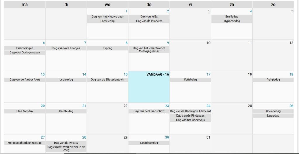 Zo beland ik op een site die heet: “Fijne Dag Van”. Hierop vind ik overzichten van themadagen. Leuk om schrijf inspiratie op te doen, maar dan lees ik: Helaas, vandaag is er geen ‘Dag Van‘.