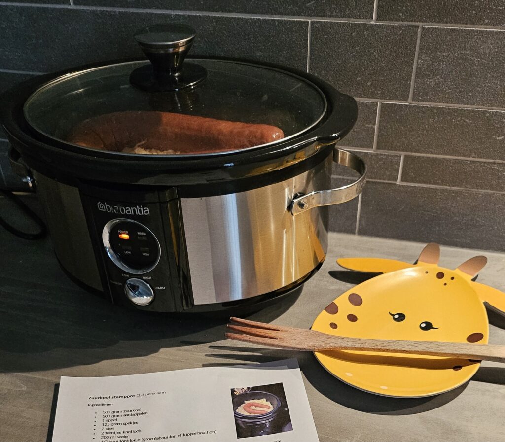 Wat is er nou makkelijker dan na de koffiebijeenkomst bij ons beneden in de gezamenlijke ontmoetingsruimte te roepen: “Wat zal ik eens eten?” De recepten worden je dan zomaar in de schoot geworpen. Eén van mijn buurvrouwen appte mij onmiddellijk een recept van een zuurkoolstamppot uit de slowcooker. Zij had die van haar dochter en die op haar beurt weer van een kookwinkel. Een letterlijk beproefd recept dus.