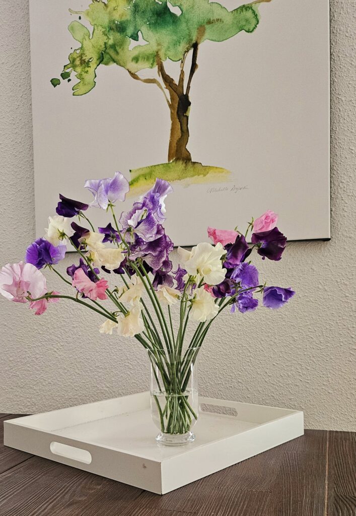 Met mijn ogen dicht zit ik aan de eettafel en snuif de subtiel zoetige geur van lathyrus op.