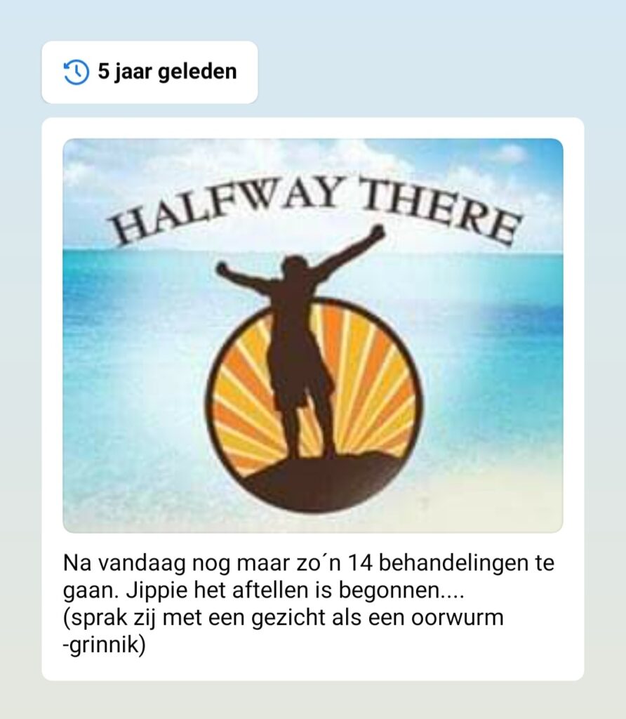 Halverwege was ik, meldde ik vijf jaar geleden dus op Facebook. De behandeling zou tien weken duren, dus ik had nog 5 weken te gaan -dacht ik…