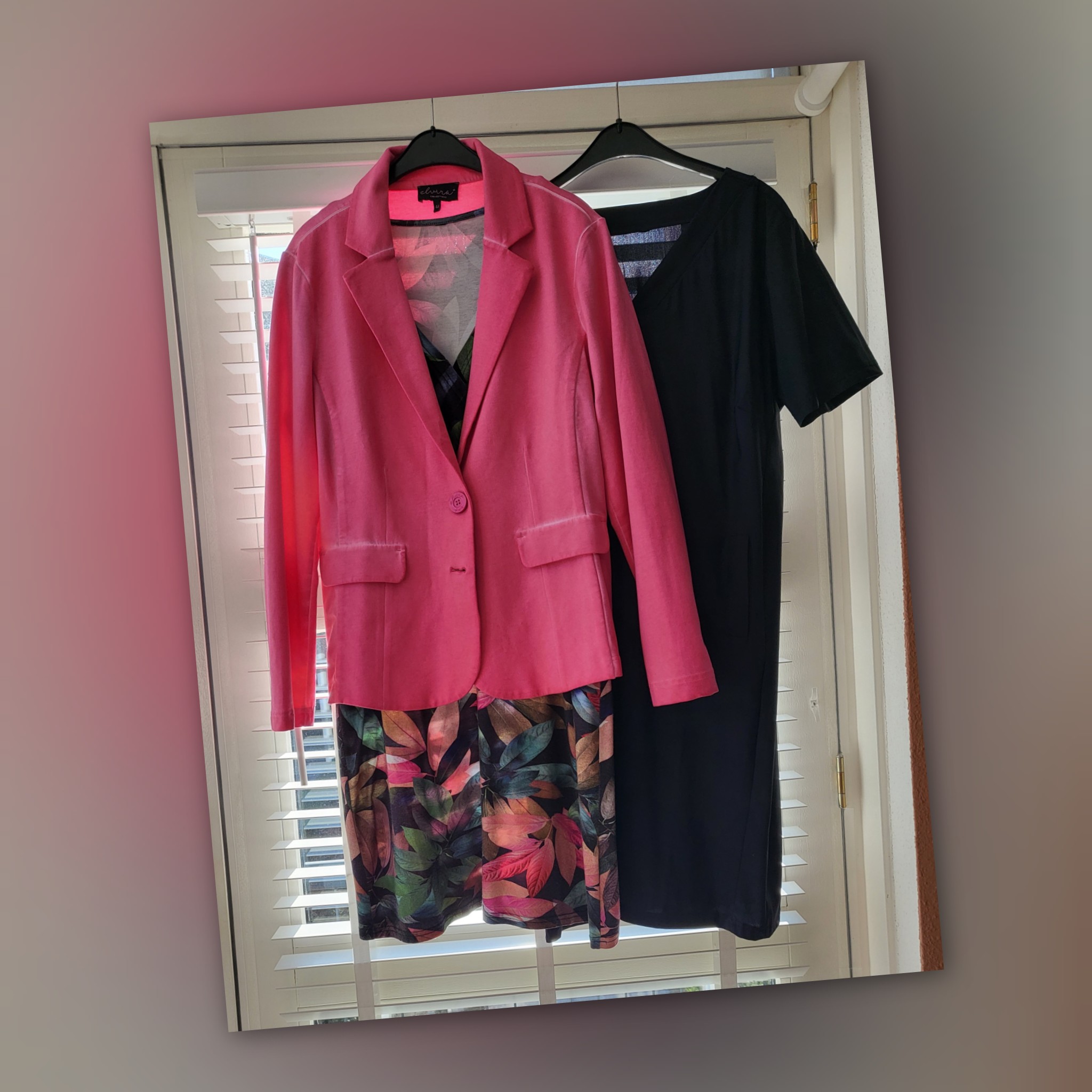 Tsja.. en dan zie je ineens al die felle kleuren, na een zwart/bruin/marine wintergarderobe. En pardoes liep ik ook nog eens tegen een rek vol met fuchsia kledingstukken aan. Ik viste er een blazer tussenuit van soepele joggingstof. Of wacht, noemen ze dat tegenwoordig eigenlijk nog wel zo? Of hebben ze daar een andere kekke benaming voor bedacht, zoals die van ‘travelstof’. Alsof die stof reist! Oké, ik begrijp de strekking wel, maar ik blijf het een rare naam vinden. Maar goed, kleding van joggingstof suggereert dat je er mee jogt, althans…dat was vroeger (wie jogt er nu nog??). Nu hang je er mee op de bank een serie te bingen of iets dergelijks.